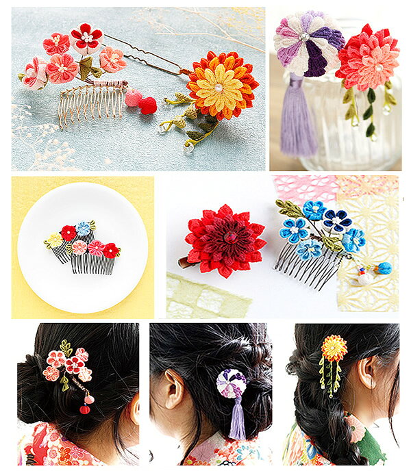 作品サイズ:約W12.5cm×H3.5cm セット内容:ちりめん、 かんざし、作り方説明書 その他付属品、はさみ、ツマミッコ、ボンド 丸つまみの花がつついた かんざし が作成できます。