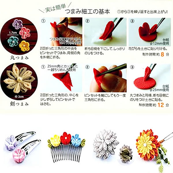 ちりめんで作る、愛らしいつまみ細工 花しごと シリーズの新商品! はさみ、ツマミッコ、ボンド付きセット 付きなので、すぐに作ることができます。
